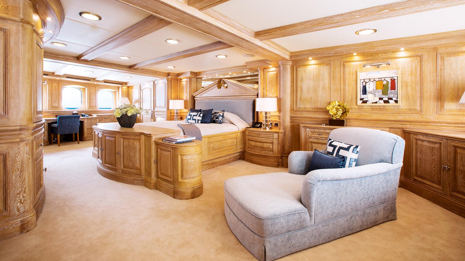 The six beautifully decorated state rooms have also been restyled. There’s a huge master suite stretching across the forward section of the main deck. A private office, lounge, sleeping area, his and hers marble bathrooms complete this luxurious accommodation.