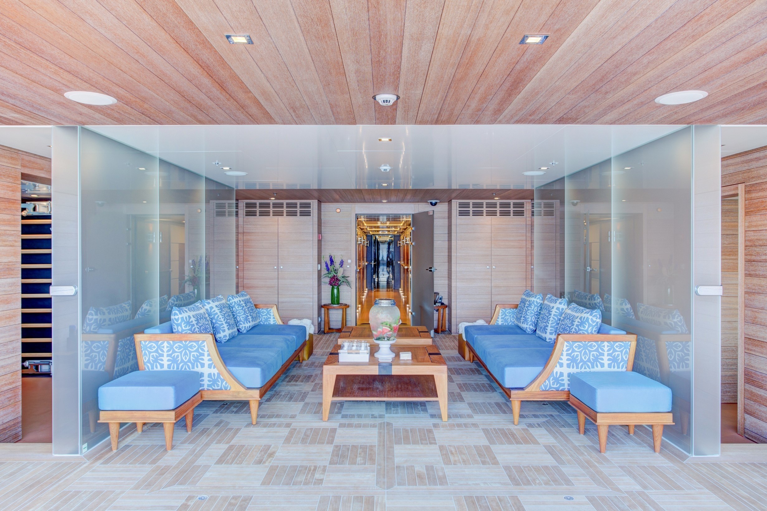 Once you step on board via the aft deck, you will see an inside-outside veranda. Beautifully designed curved glass doors slide open to reveal two blue and ivory areas mirrored to port and starboard. These areas are perfect for relaxation so why not enjoy a glass of champagne to start your vacation off?