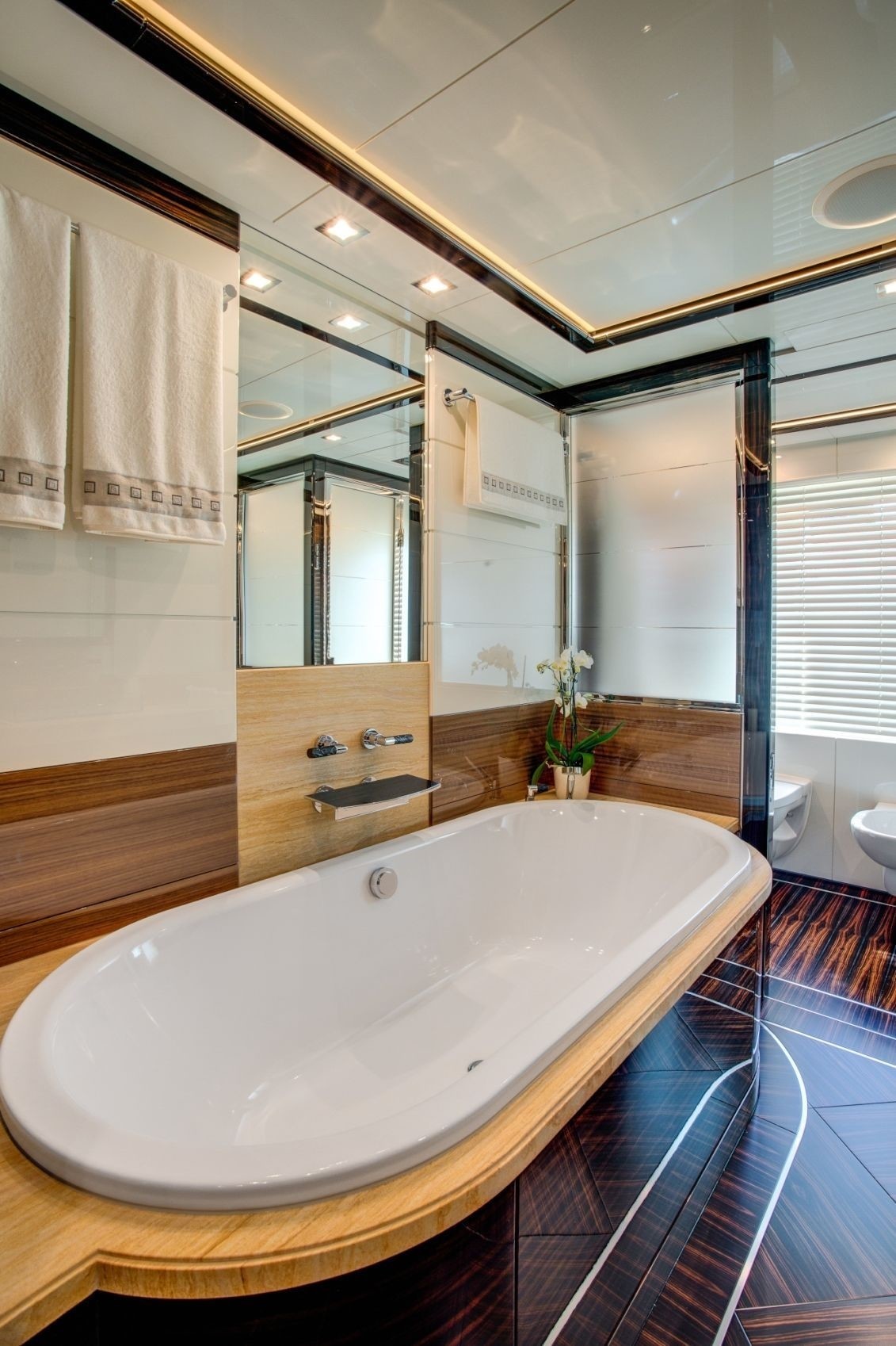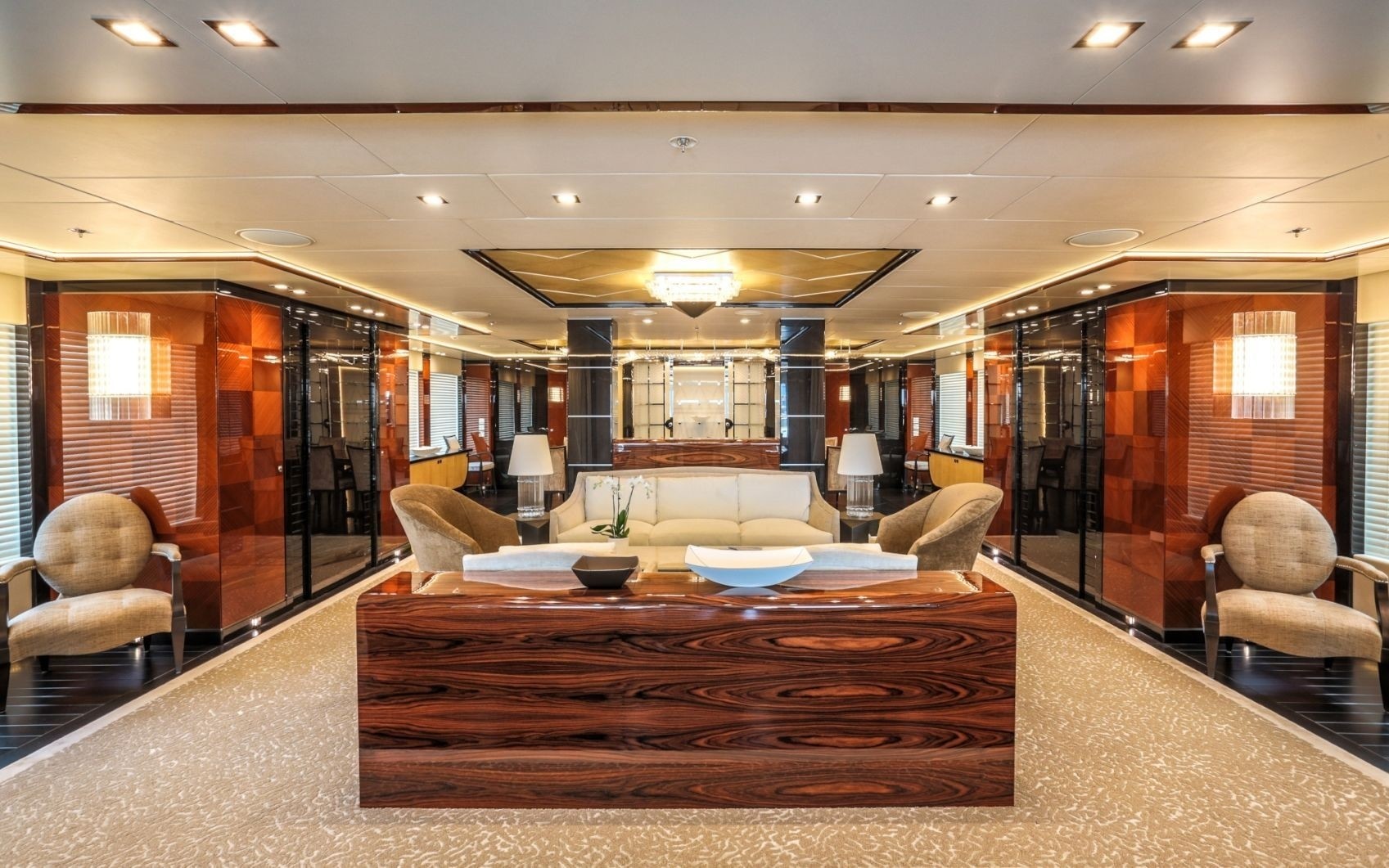 Panels of golden goatskin parchment add a touch of luxury and warmth to Party Girl. Ebony and Canaletto walnut ooze charm to give an appealing and inviting ambience. This is an informal area on Party Girl, however it’s still stunning even with its laid-back atmosphere.