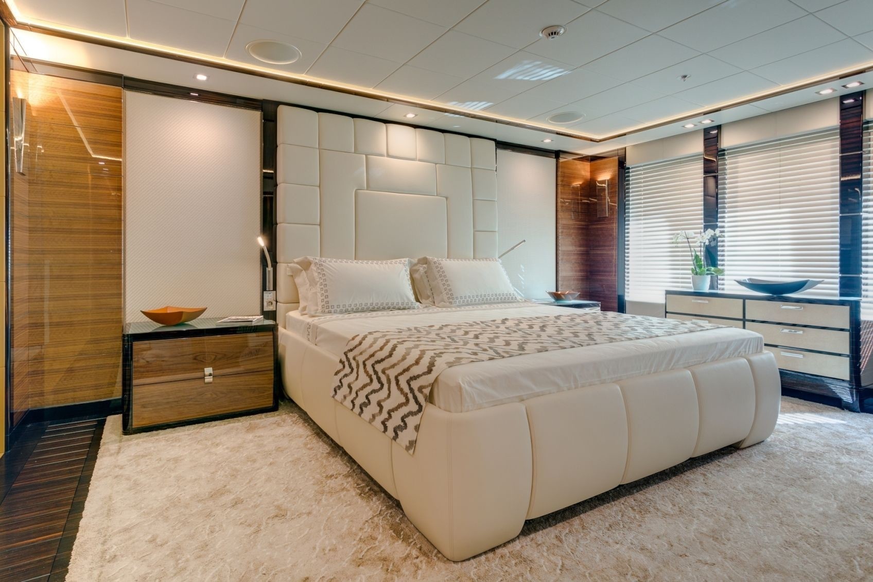 You’ll be shown to your cabin once you’ve embarked on Party Girl. There are two master suites, one on the main deck forward, the other on the upper deck forward. These can be combined together to create a two-storey penthouse. With this option, Party Girl is ideal when catering for large charter groups or friends who might share the costs of chartering such a prestigious vessel. Both suites are decorated in Canaletto walnut and ebony, these woods are light in colour and provide a less formal feel.