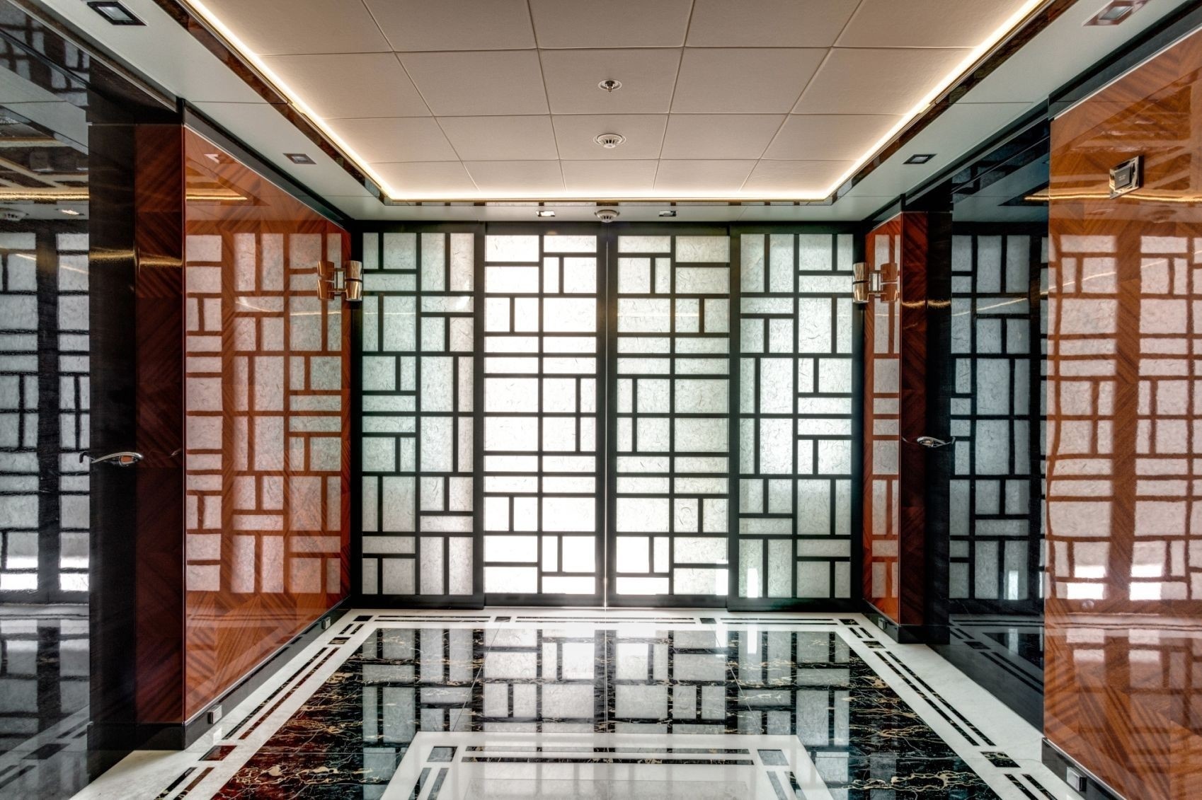 As the hub of the superyacht, the central lobby is outstanding in décor, furnishings and colour schemes. A corridor to starboard leads to this lobby that has a unique mirrored ceiling. The amazing Portoro marble floor shimmers in the light with white and gold streaks. More light filters through a Japanese shoji screen which is part of the main entrance to starboard. You simply can’t miss the unusual toucan ornament made from glittering gemstones that overlooks the entrance. The tan coloured staircase complete with “floating” treads and a weaved leather handrail, leads to decks below and above.