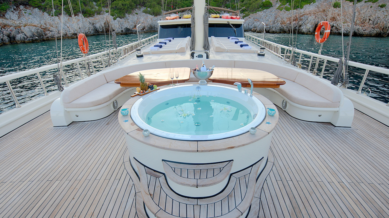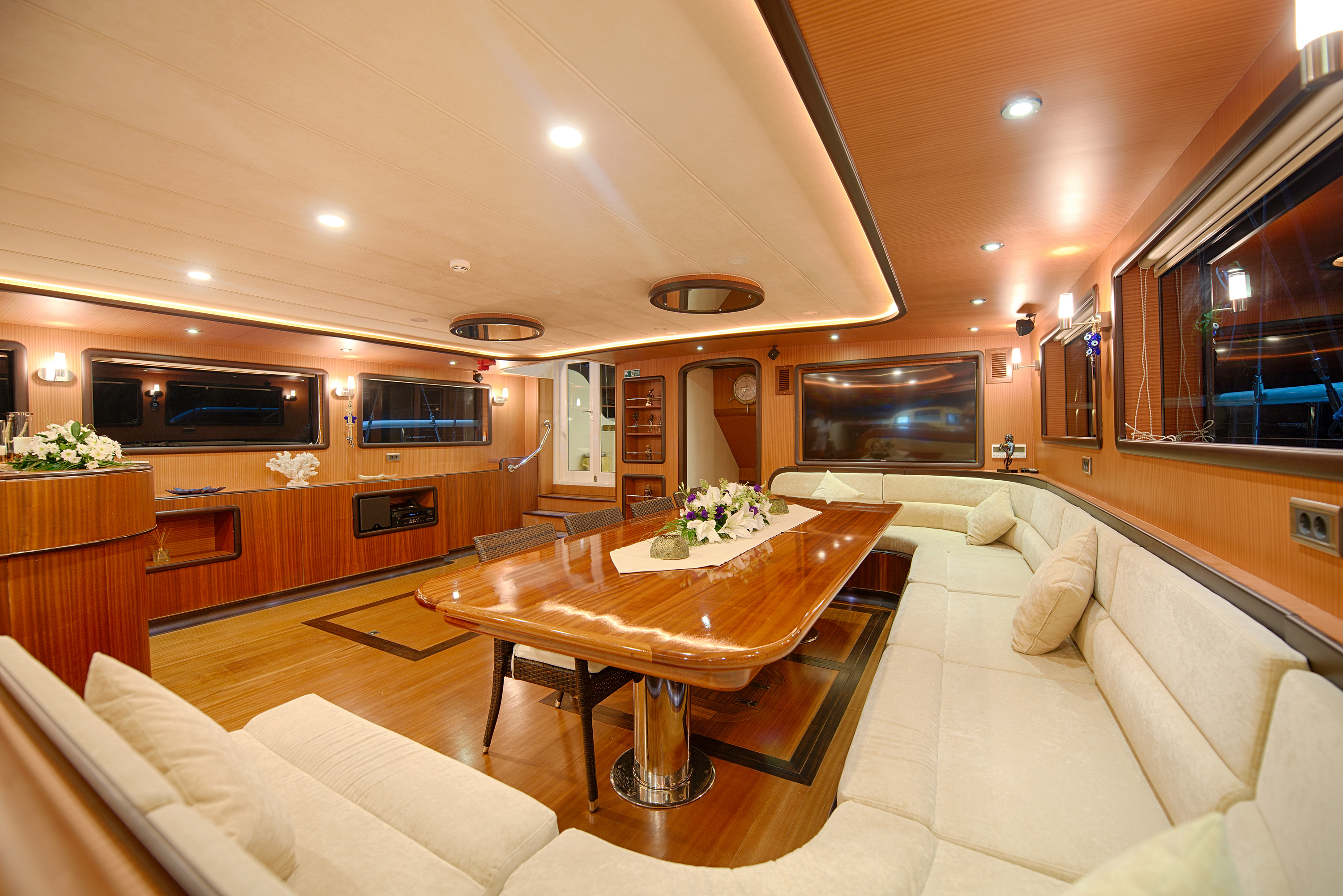 The canvas covered aft deck is designed for groups to dine alfresco together and savour the warmth and clean air, and the wet bar has a selection of refreshments to complement any dish. The comfortable curving sofa makes the place enticing to sit and rest even outside of mealtimes, whilst taking in the views of such places as the serene islands around Bodrum and Marmaris. Sunbeds along the stern are the perfect place to unwind in the midday heat, and guests who want to cool off with a dip into the sea have easy access down the gangplank.