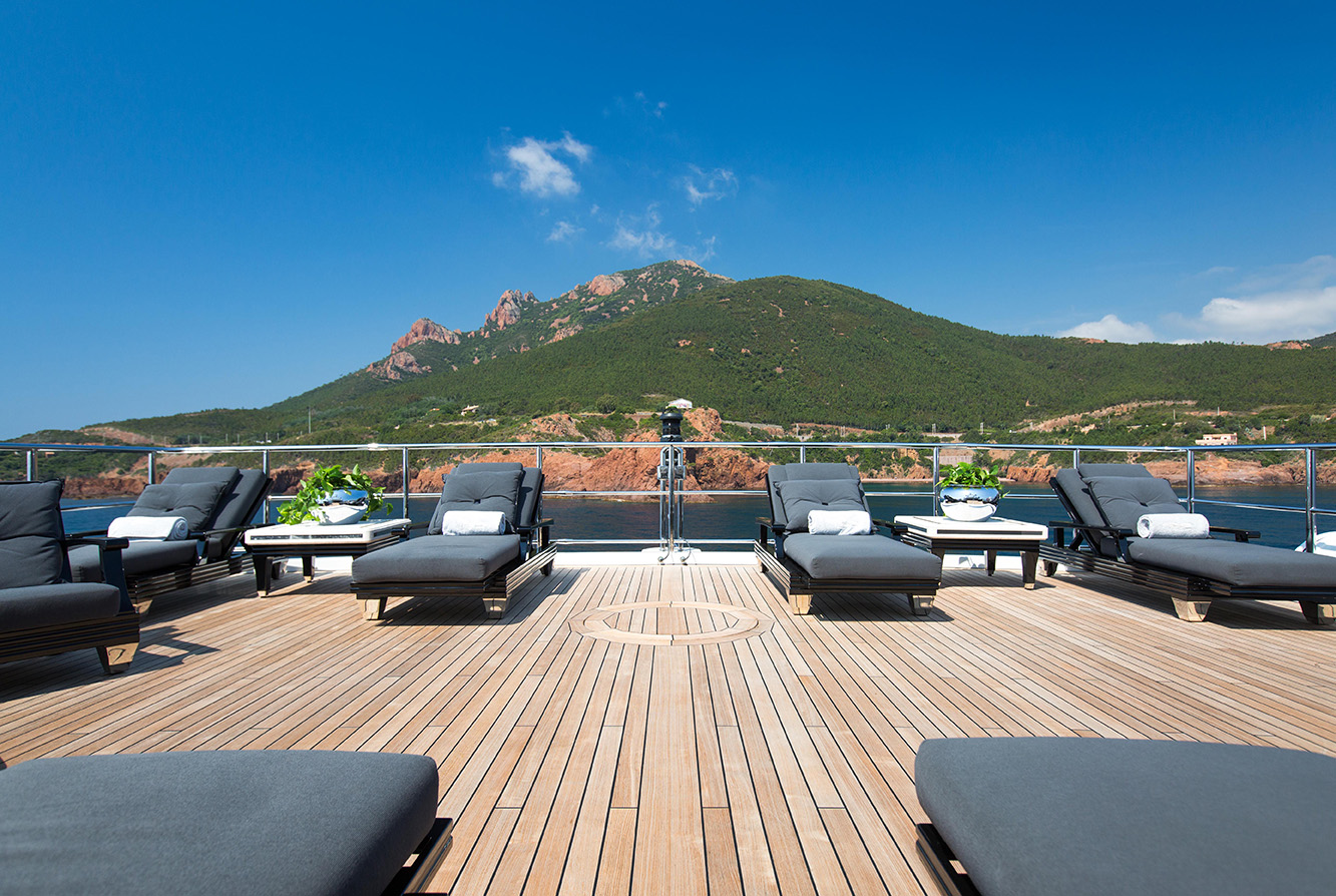 Throughout your yacht charter voyage there will be lots of opportunity to lounge around. Why not socialise with friends or family on the upper deck aft? Built-in sofas lie underneath two black parasols which will keep you cool from the hot sun. For al fresco dining for up to 16 guests, a long glass table lined with black and white chairs makes a beautiful setting.