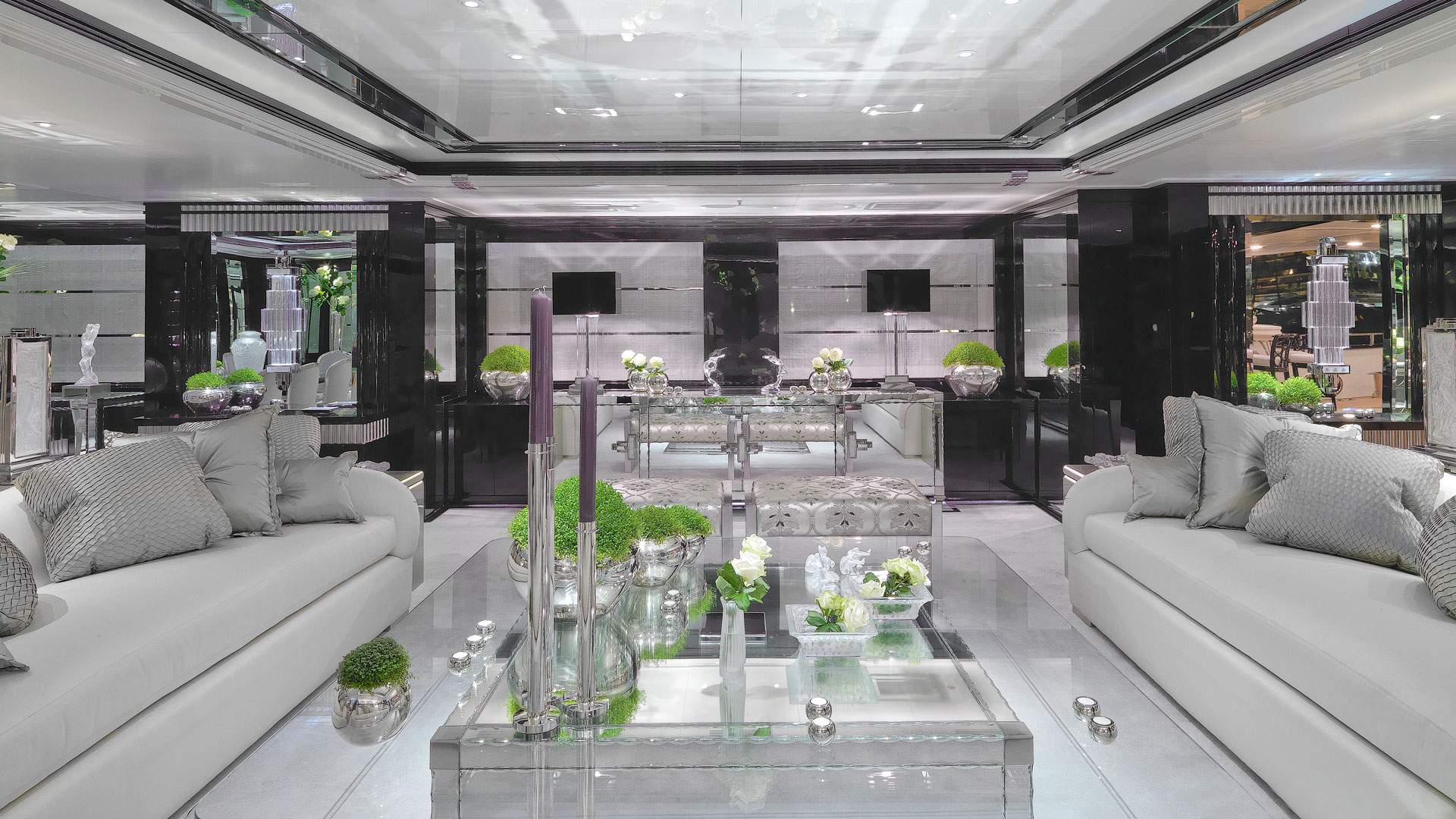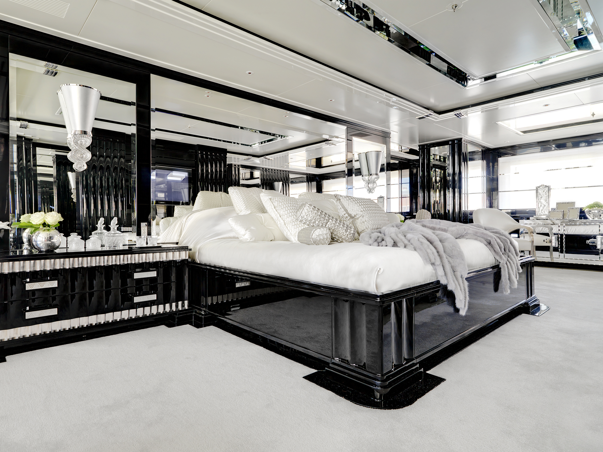 The white bed linen and upholstery is contrasted by a glorious crystal dressing table. Behind the bed are two dressing rooms, to starboard and port. This leads through to his and hers onyx-clad bathrooms. One of the highlights in these accommodation quarters is the bath tub in the “her” bathroom which was carved from one single piece of stone.