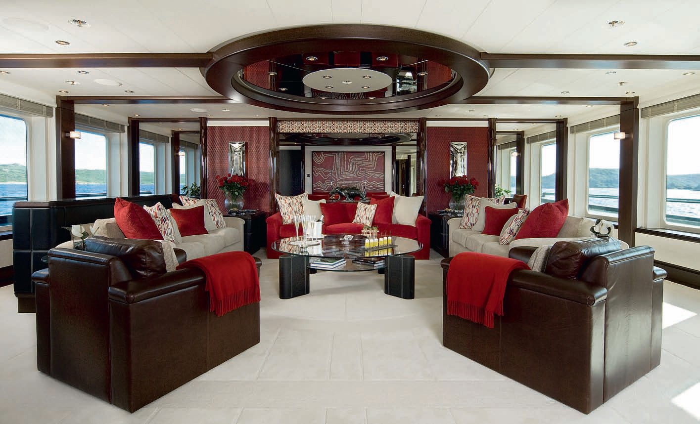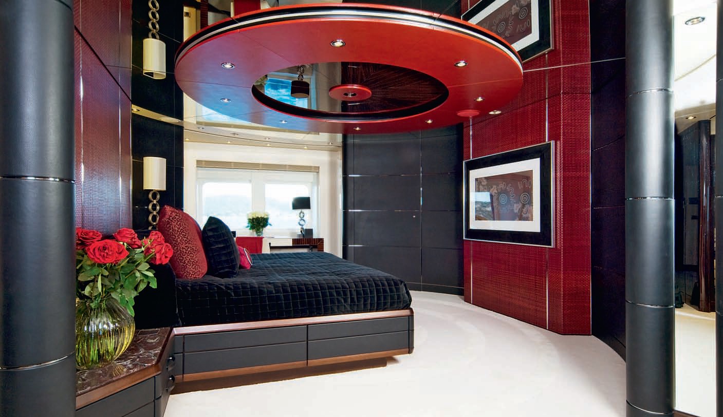 The main saloon can be found aft of this entrance hall where again aboriginal paintings hang. They are reflected beautifully in the high gloss ebony dining table with dark wenge mullions wrapping their way across the ceiling. Bulkheads in red and leather dining chairs go perfectly with the white carpet, adding a dramatic look.