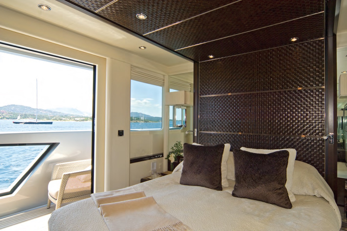 An electronically controlled 4m cinema screen can be unrolled upwards from a chaise lounge to meet the ceiling with a projector that drops down. Black out blinds cover the windows to provide a real cinema experience while guests chill on comfortable sofas or armchairs. A round dining table made from limed wenge is further aft and another design feature from Andrew Winch. Curved floor-to-ceiling windows slide open creating a semi al fresco space and access to a lounging area.