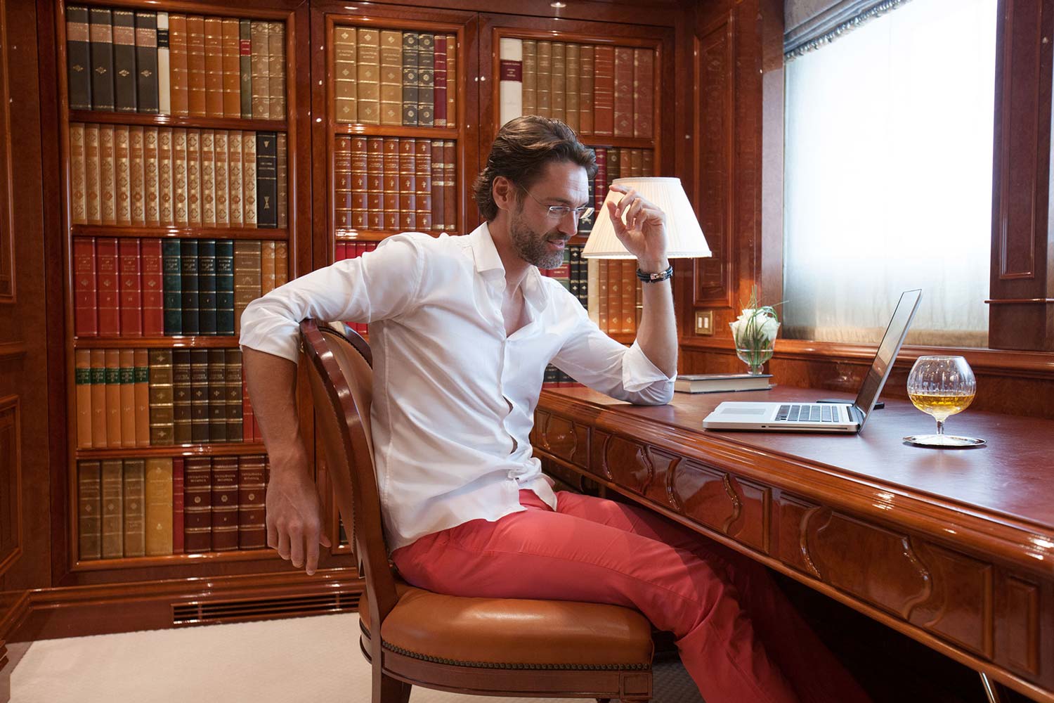 A VIP suite is situated stretching across the full beam of the lower deck. This comprises of a sofa, desk, spacious mirrored closets and a large bed. There’s also a huge bathroom decorated in grained gold marble. Further guest accommodation comprises of two twin and two double cabins. They are named after Italian hotels and are furnished in different colours ranging from pastel green to cream, gold to rose.