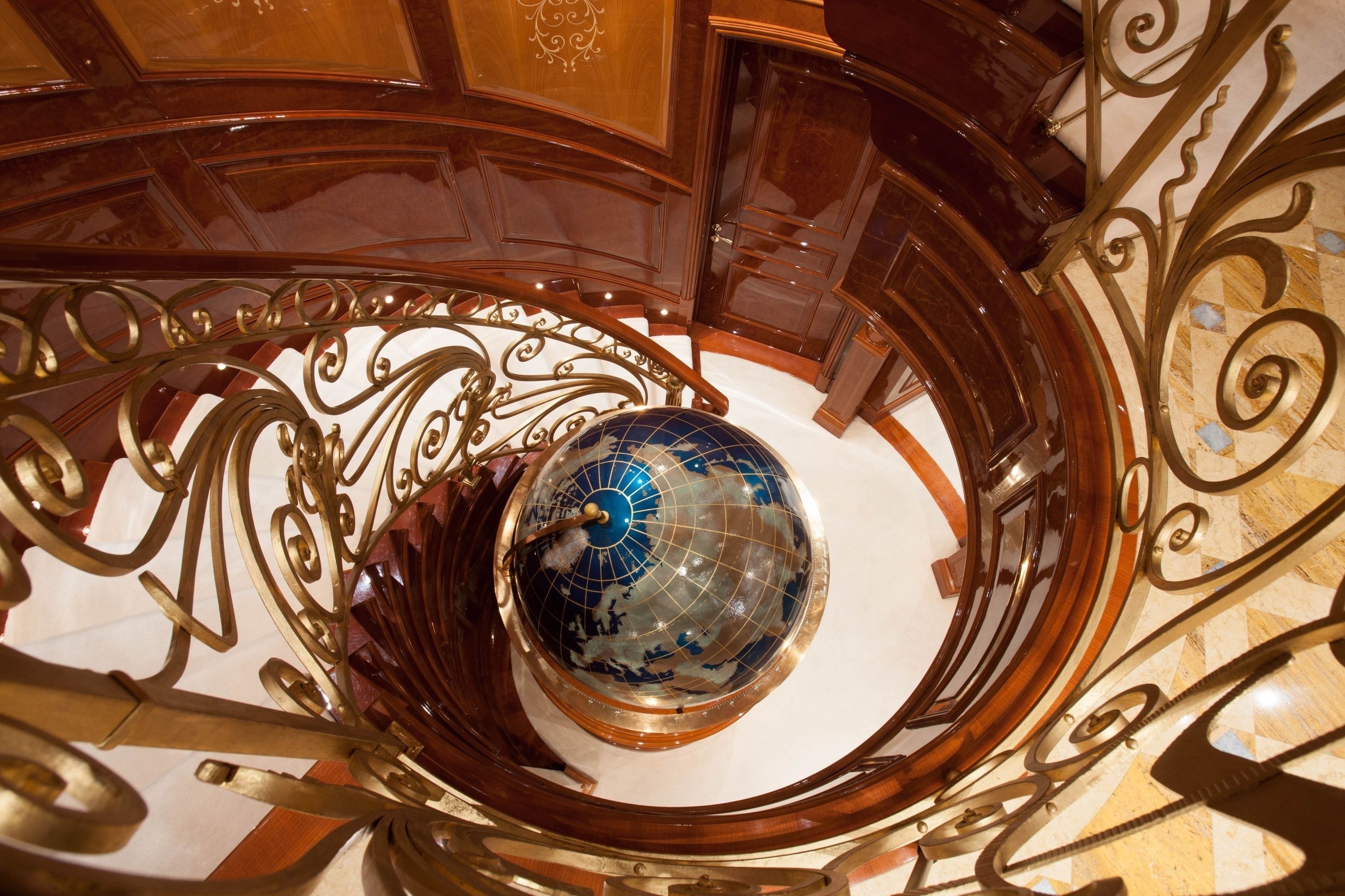 To reach the four guest state rooms, go down the central staircase to the lower deck. Here there is a fabulous globe sculpture, designed by David Harbour, in 24 carat gold, a masterpiece indeed! This globe is used as a drinks cabinet with an exterior depicting the mythical land of Xanadu. Just as a matter of interest, the motor yacht St David was named after the designer of this outstanding globe.